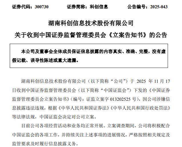 11月17日,科创信息(300730.SZ)发布公告称,公司于当日收到中国证监会下发的《立案告知书》,因公司涉嫌信息披露违法违规,中国证监会决定对公司立案。目前公司各项经营活动和业务均正常开展,将积极配合调查股票怎么开通杠杆,并持续关注进展情况,及时履行信息披露义务。