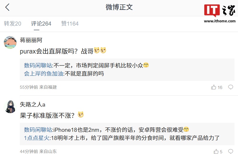 有网友询问华为 Pura X 是否会推出直屏版,博主表示:“不一定,市场判定阔屏手机比较小众。”还有网友询问苹果的标准版机型是否会涨价,博主称:“iPhone18 也是 2nm,不涨价的话,安卓阵营会很难受。”