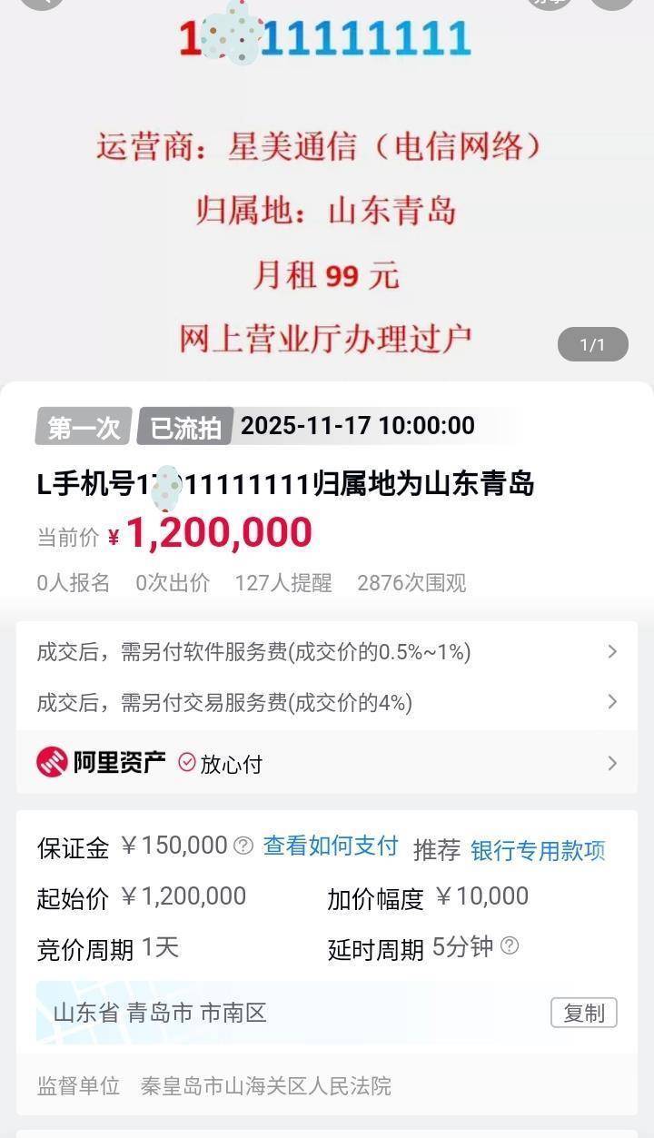 11月16日至17日,一个尾号为8个“1”的手机靓号在阿里拍卖平台上开拍,起拍价为120万元。17日上午10时,此次拍卖结束,因无人出价而流拍。