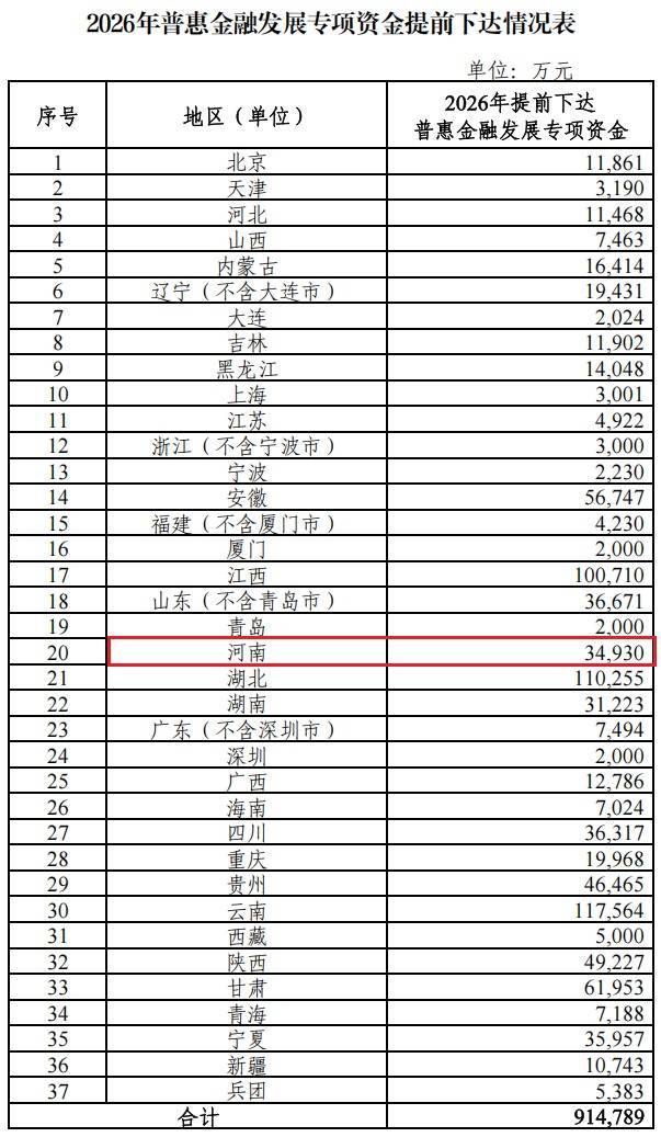 【大河财立方消息】11月19日,财政部发布关于提前下达2026年普惠金融发展专项资金预算的通知。本次下达金额合计91.48亿元中国配资网网站,其中河南获3.49亿元。